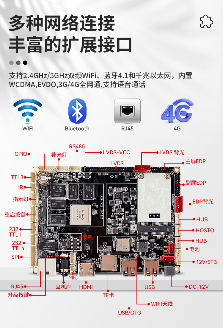 ◆高集成度。集成USB/LVDS/eDP/以太网/HDMI/WIFI/蓝牙于一体,简化整机设计,可插TF卡.